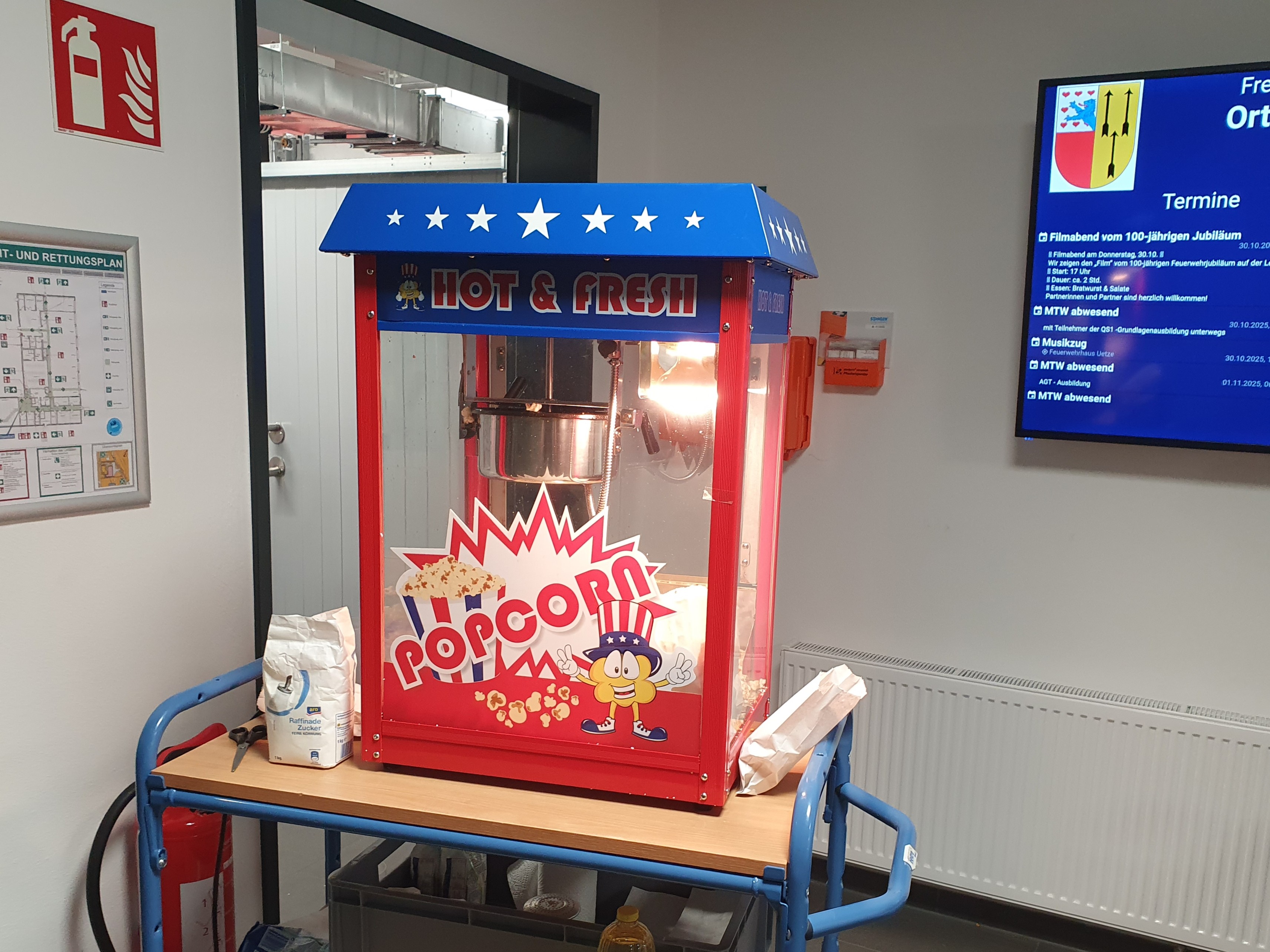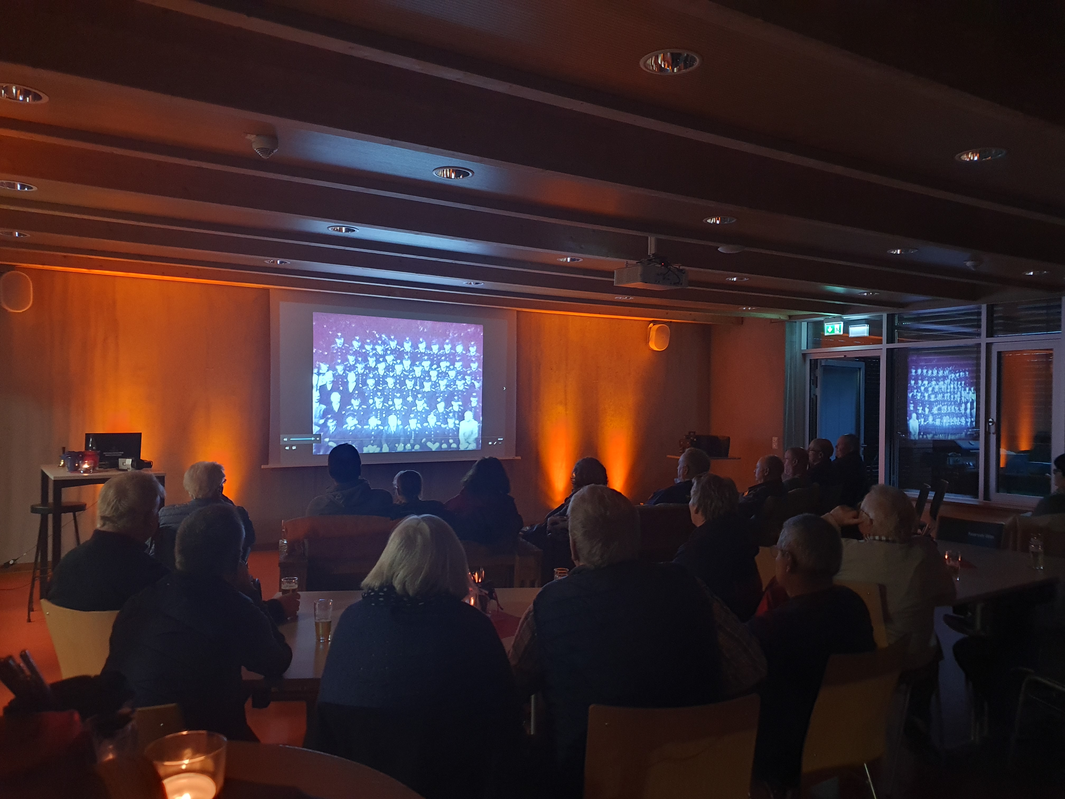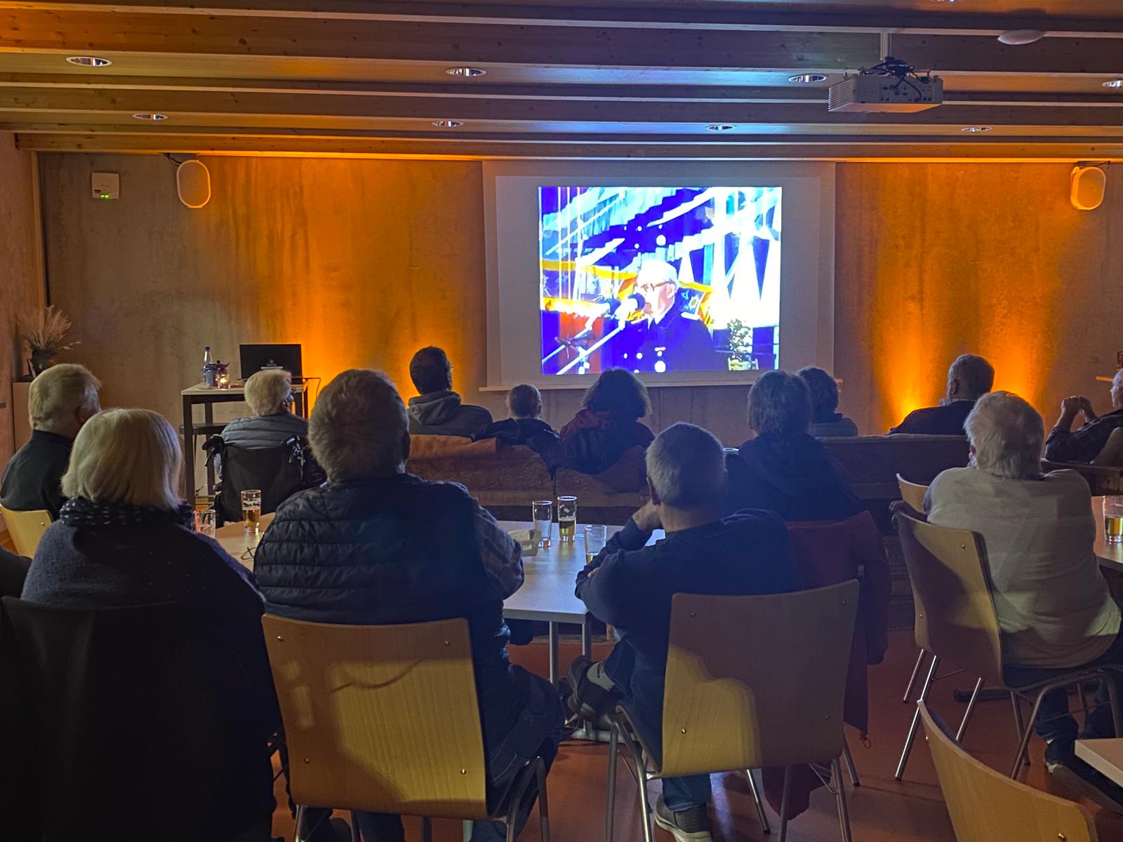 Der Schulungsraum wurde zu einem Kinosaal. Im Eingangsbereich gab es eine Popcorn Maschine und nette Beleuchtung schuf eine gemütliche Atmosphäre. Die Zuschauer, von denen einige selbst damals dabei waren, genossen den Rückblick an die damalige Zeit.
